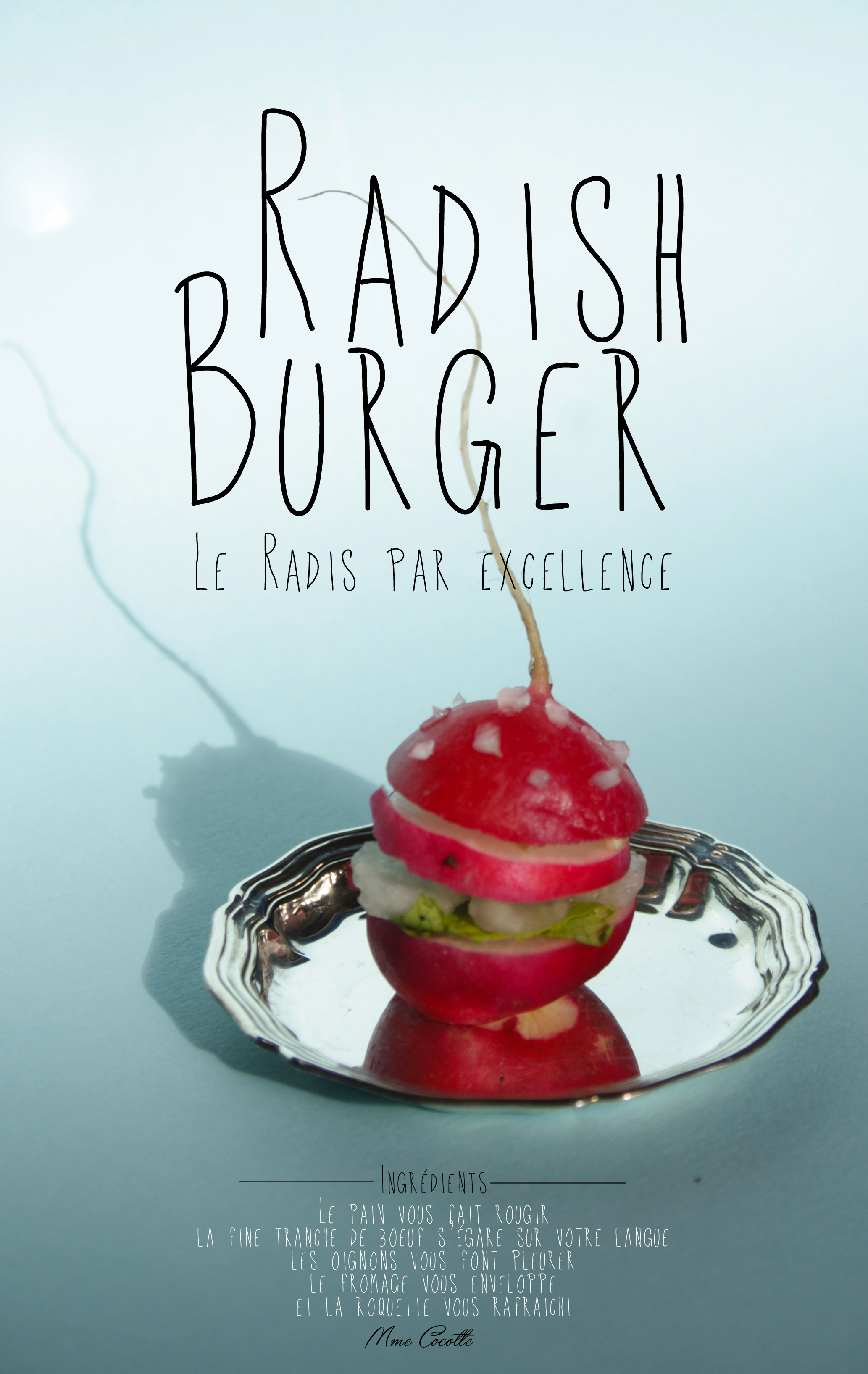 Radish burger. Petit traité sur le radis dans tous ses états. Ingrédients: Radis entier (peau, racine pivot, feuilles). A short treatise on radishes in all their forms. Ingredients: Whole radish (skin, taproot, leaves). Similaire