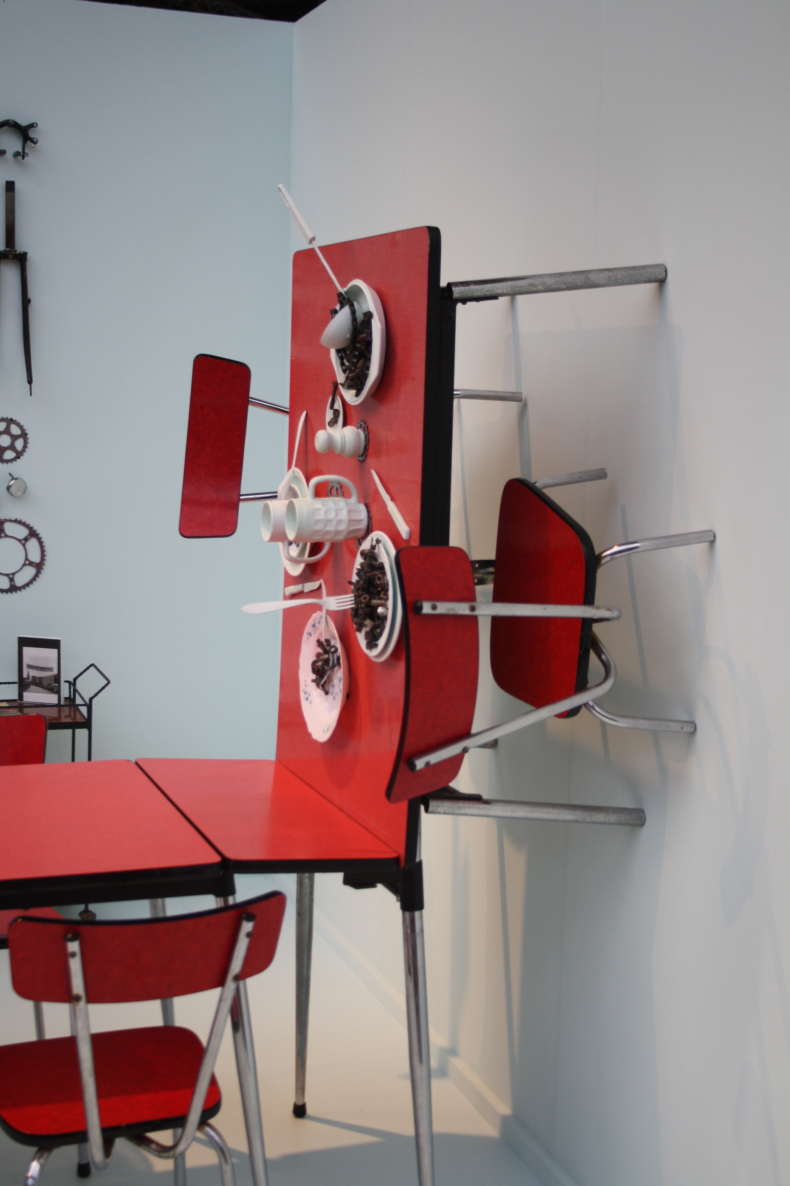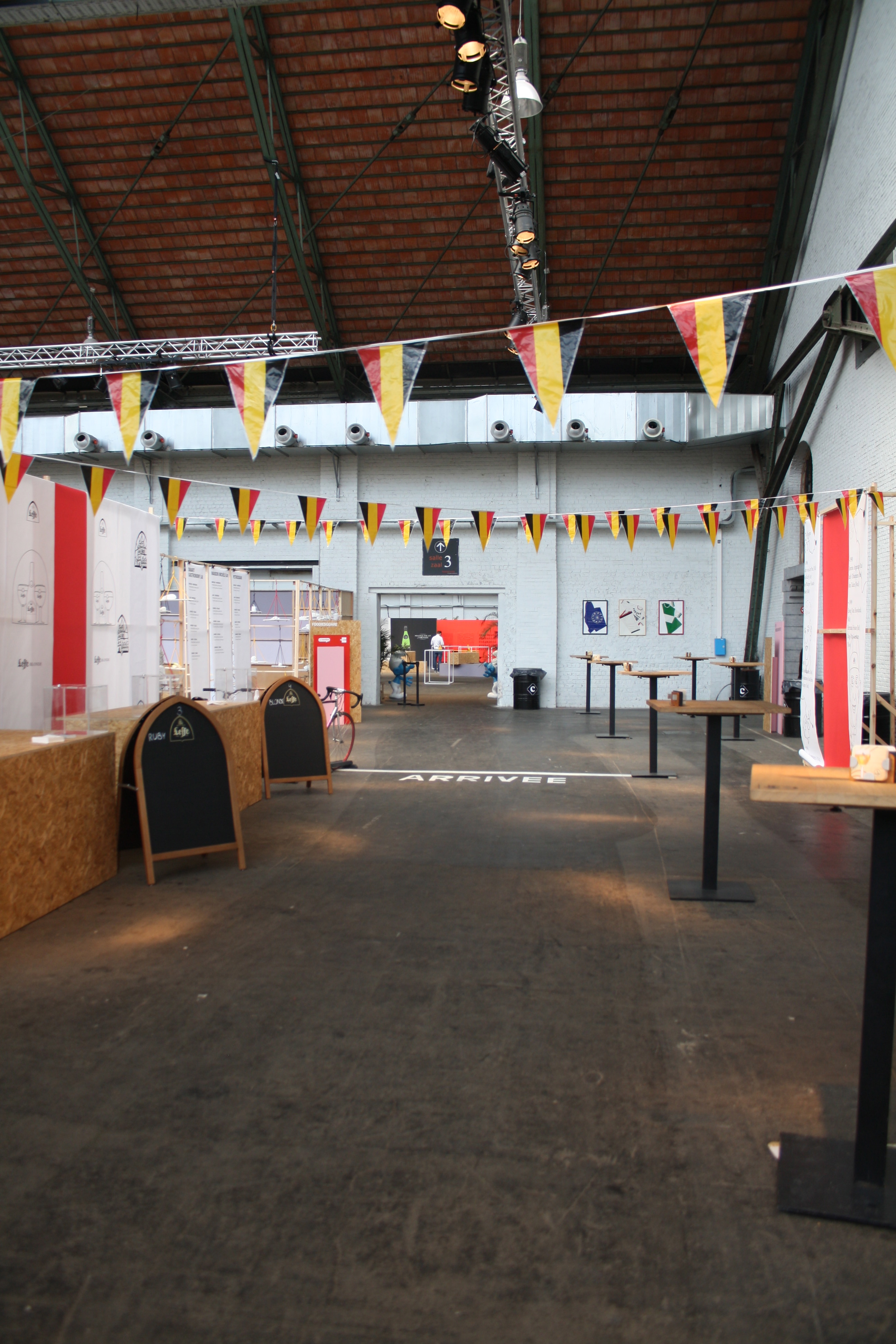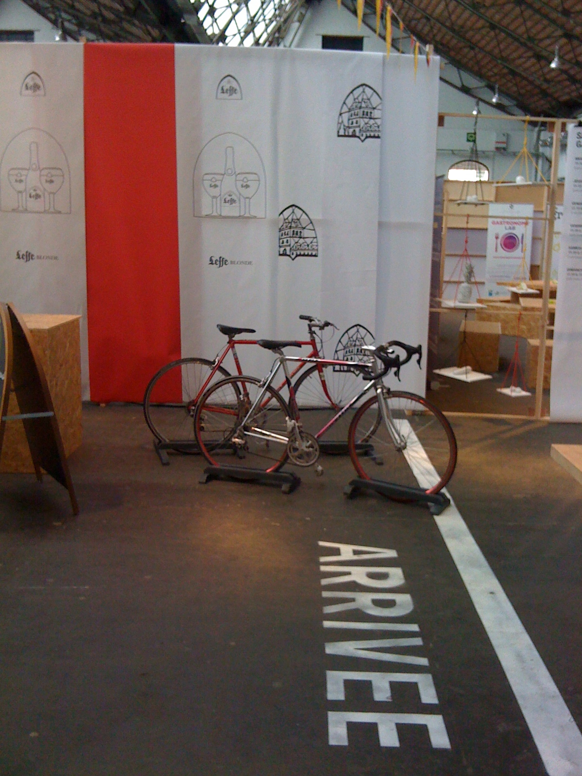Scénographie, mise en scène, « La Bouche » & Master Food design, Arba-Esa : Pour accueillir le public, l’apéronomie Leffe propose la dégustation de plusieurs amuses bouches par les chefs: Laurent Balancy et Denis Delcampe (Le Tournant), Florian Delhomme & Nicolas Soreil (L’autre grain), Julien Van de Neste (Jour de Fête), Axel Rousseau (L’Ô de Samme), Erwan Kenzo NAKATA (Gramm), Joël Geismar (Garage à manger), Wim Ballieu (Balls & Glory). Pour ce premier espace, le visiteur s’habille aux couleurs du TOUR DES FLANDRES. Eddy Merckx vient illustrer ce folklore sous forme de rétrospective photos/plans. Drapeaux et fanions du Lion animent cette course jusqu’à la ligne d’arrivée. Deux vélos de route en tête sous un fond sonore de la course (son: radio flamande, RTBF). « Il pleut sur Bruxelles » Espace Magimix, Pistolet original, et Val de Loire. Pour scénariser l’esprit belgitude j’ai proposé un plafond de parapluies noirs au dessus de trois espaces.