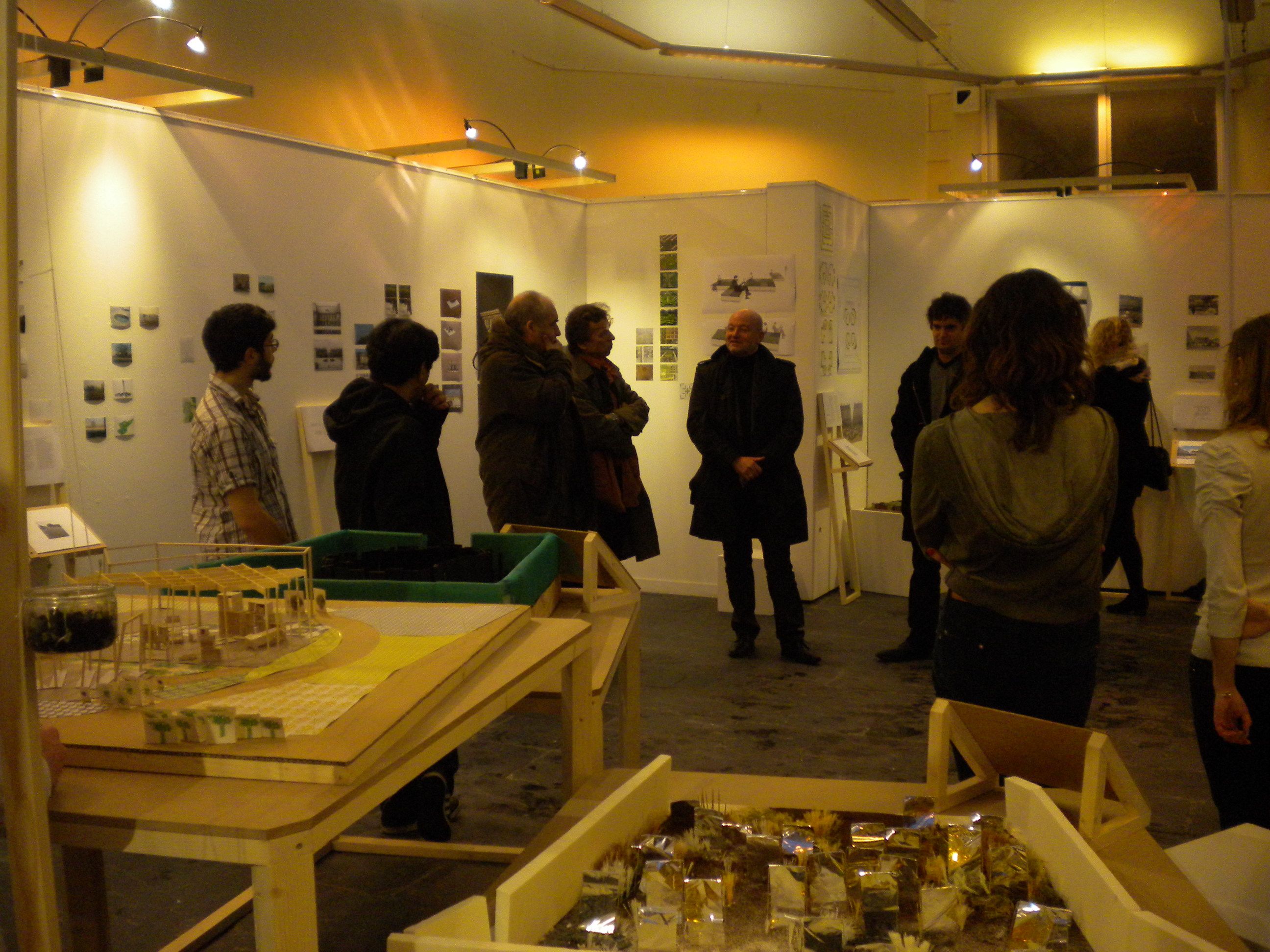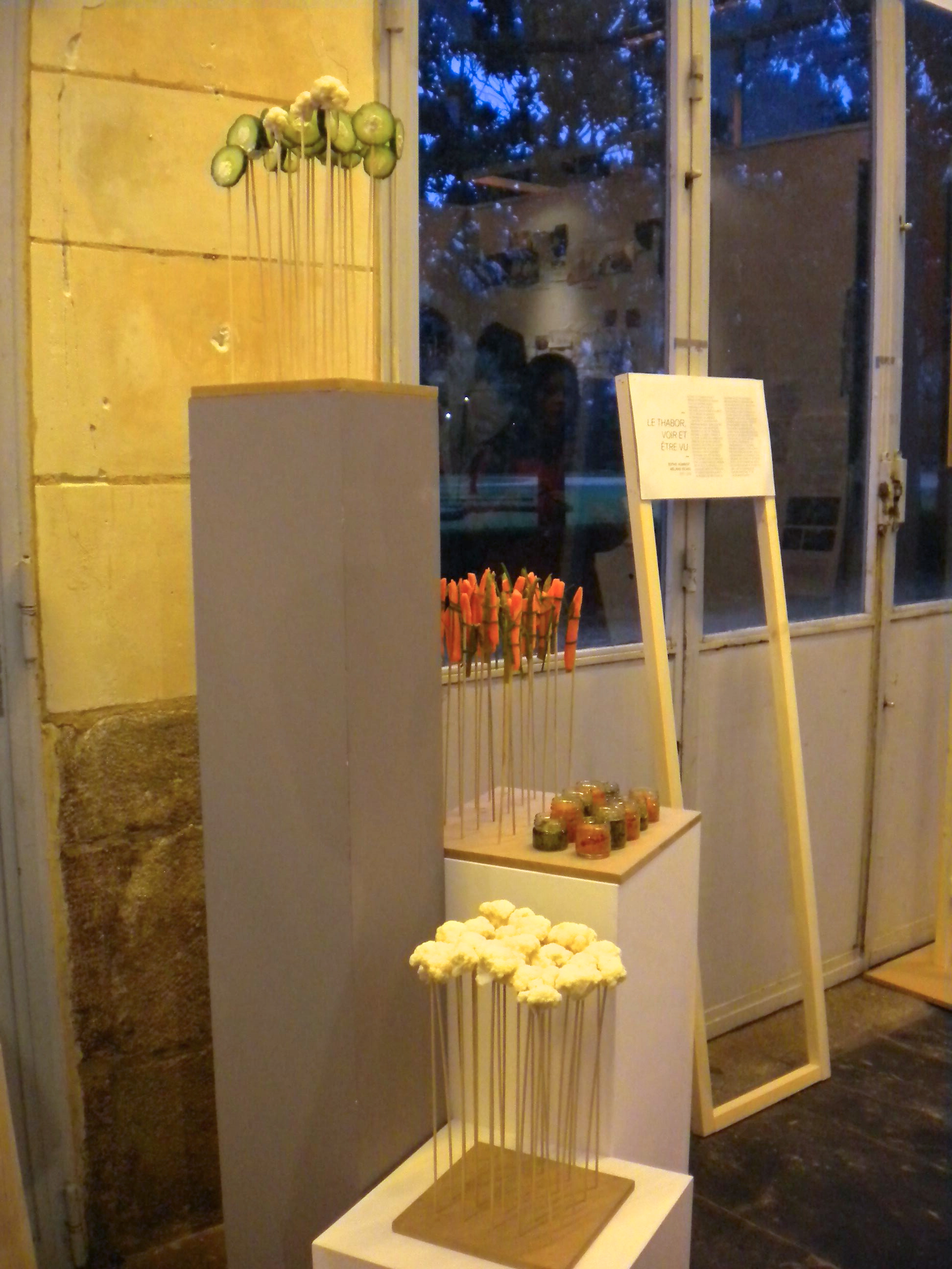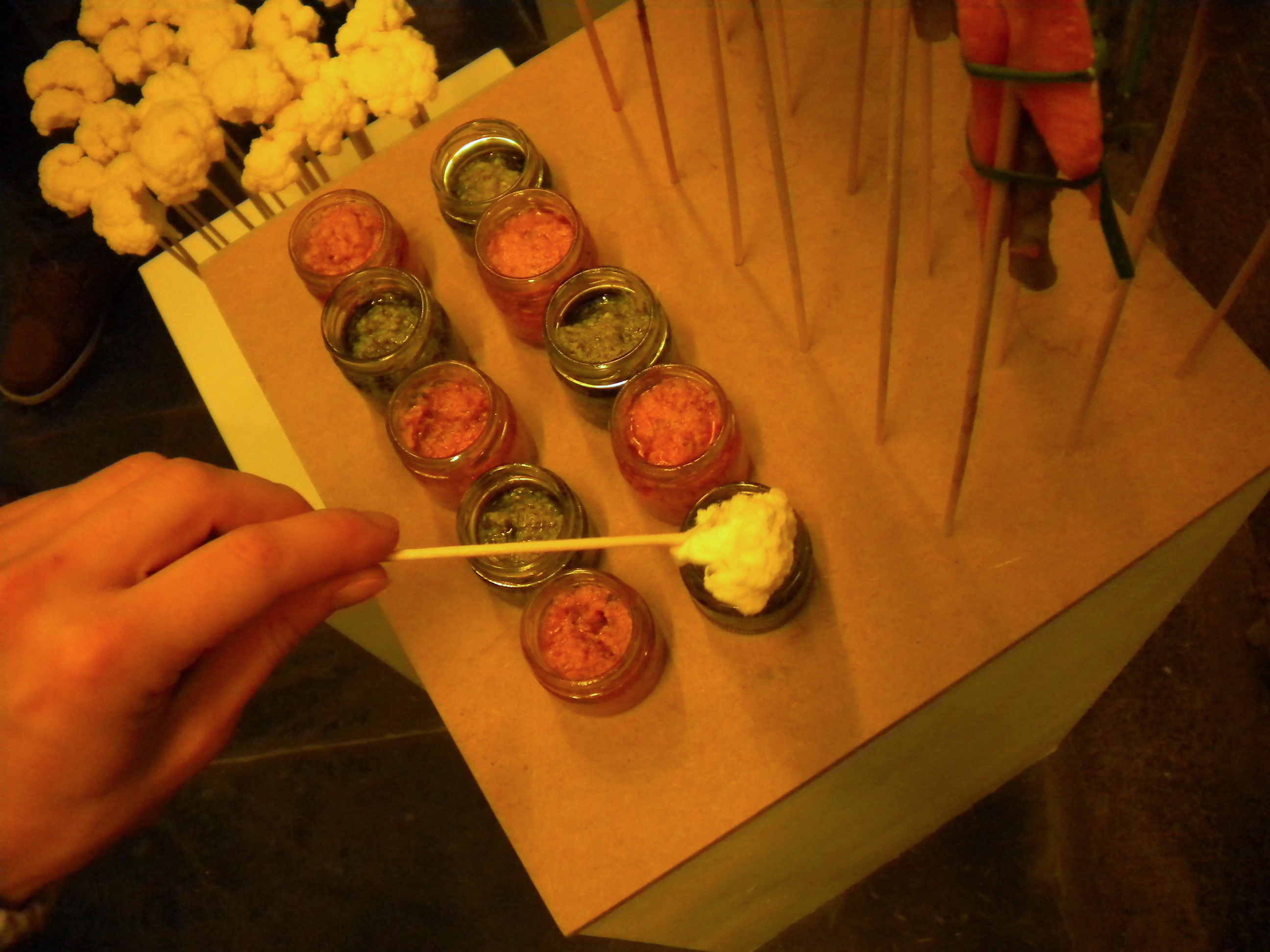 Buffet paysage, Vernissage de l’exposition « Entre parcs, places et Jardins », Orangerie du Thabor, Rennes, 2013. Ingrédients: Forêt de choux, buchettes carottes asperges ciboulette, feuillage concombre crème et épices, sauces aubergines confites/pesto.