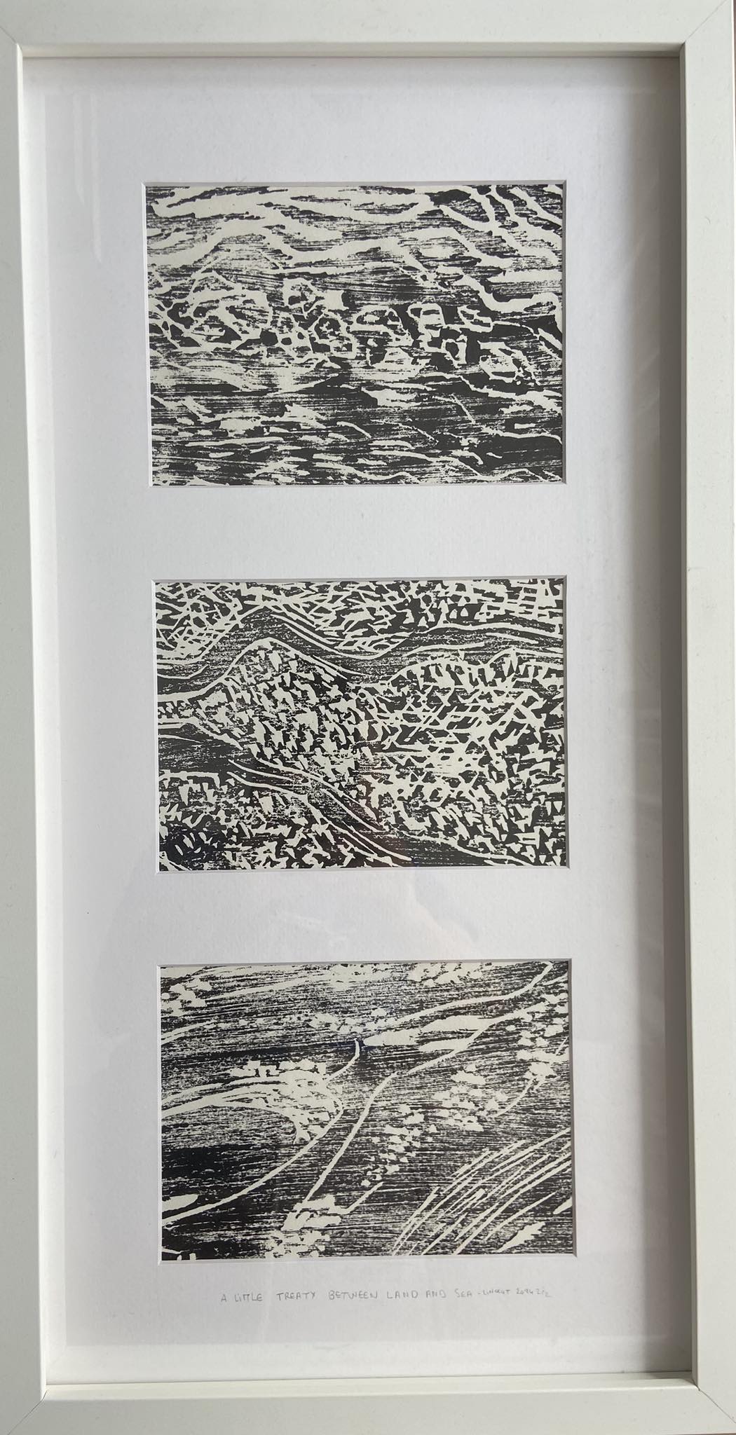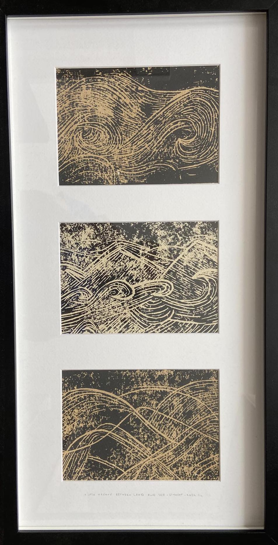 Projet pour l’exposition de l’ART UAQ 2025 à la Casa Mikoko. Cette année , le thème est sur la Nature et l’héritage. J’ai choisi de travailler sur deux triptyques en xylogravure et linogravure. Le premier sujet reprend les reliefs des Mangroves et de la nature qui apparait et disparait au fil du temps et sous l’impression de l’encre à travers le bois. Le second s’inspire des dunes, du vent et de la mer. Le papier a été imbibé dans le kawa, café typiquement local.