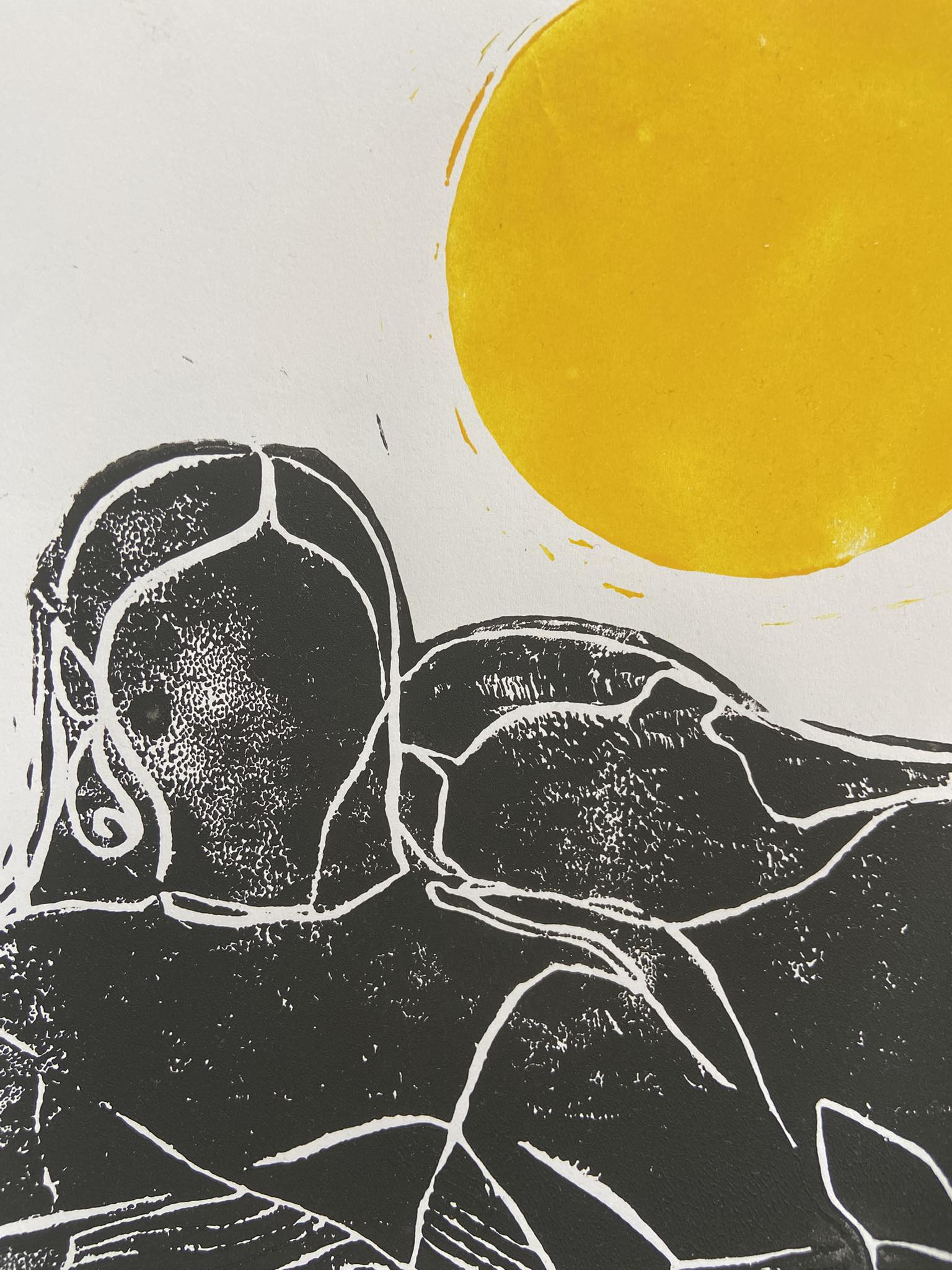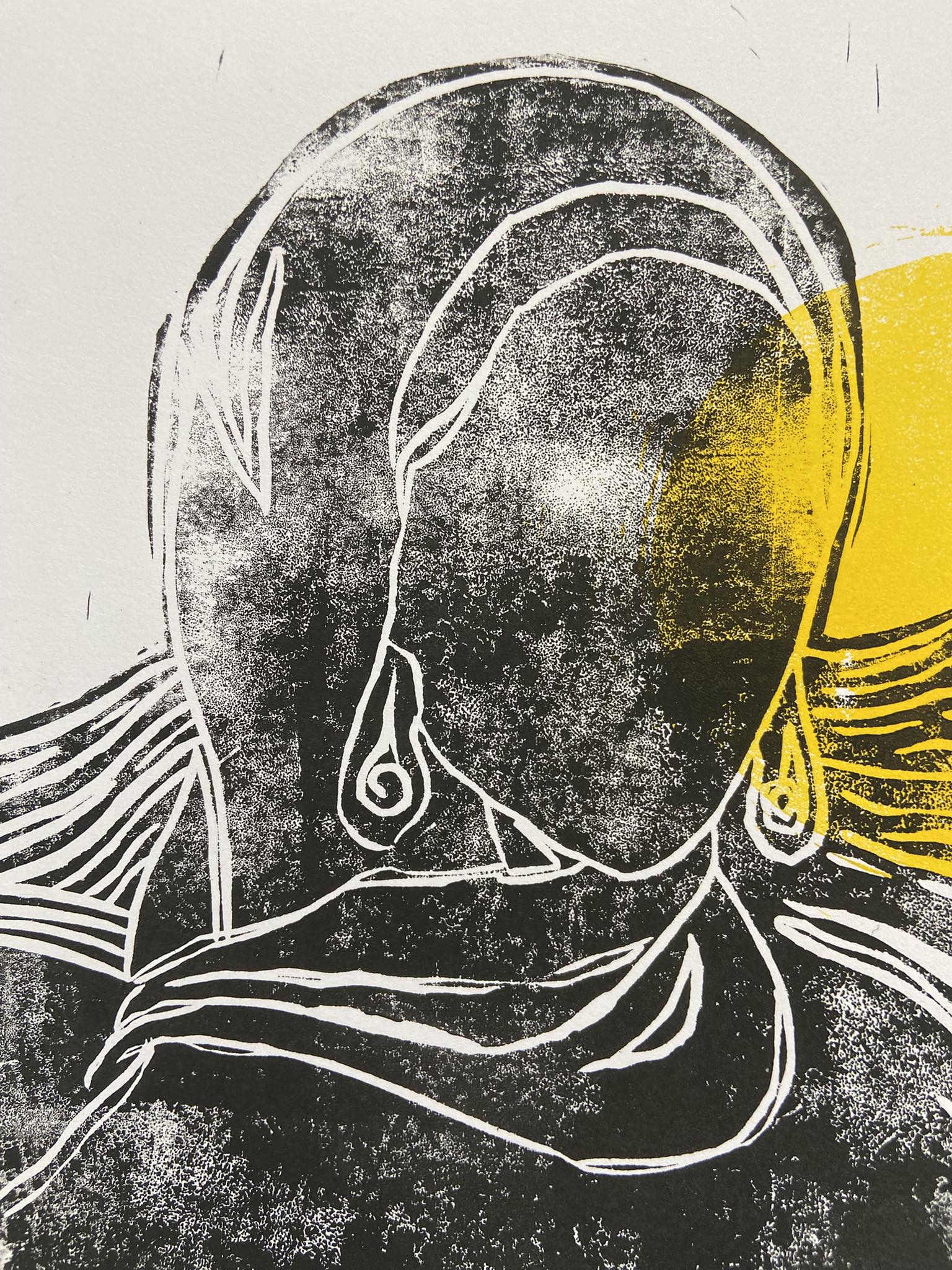 Projet réalisé dans le cadre de l’exposition « Femmes en lumière » avec le groupe AD’Art et deux autres groupes d’artistes de la communauté francophone de Dubaï. J’ai choisi la linogravure et différents types de papiers trouvés à Abu Dhabi. Papiers imbibés dans le kawa, papiers glacés ou en textures. Un triptyque, une femme, deux femmes ou trois sans visages pour représenter l’universalité. La sororité est au coeur du sujet. Le noir et blanc pour la neutralité et le jaune dans son état brut pour l’esprit lumineux en fond.