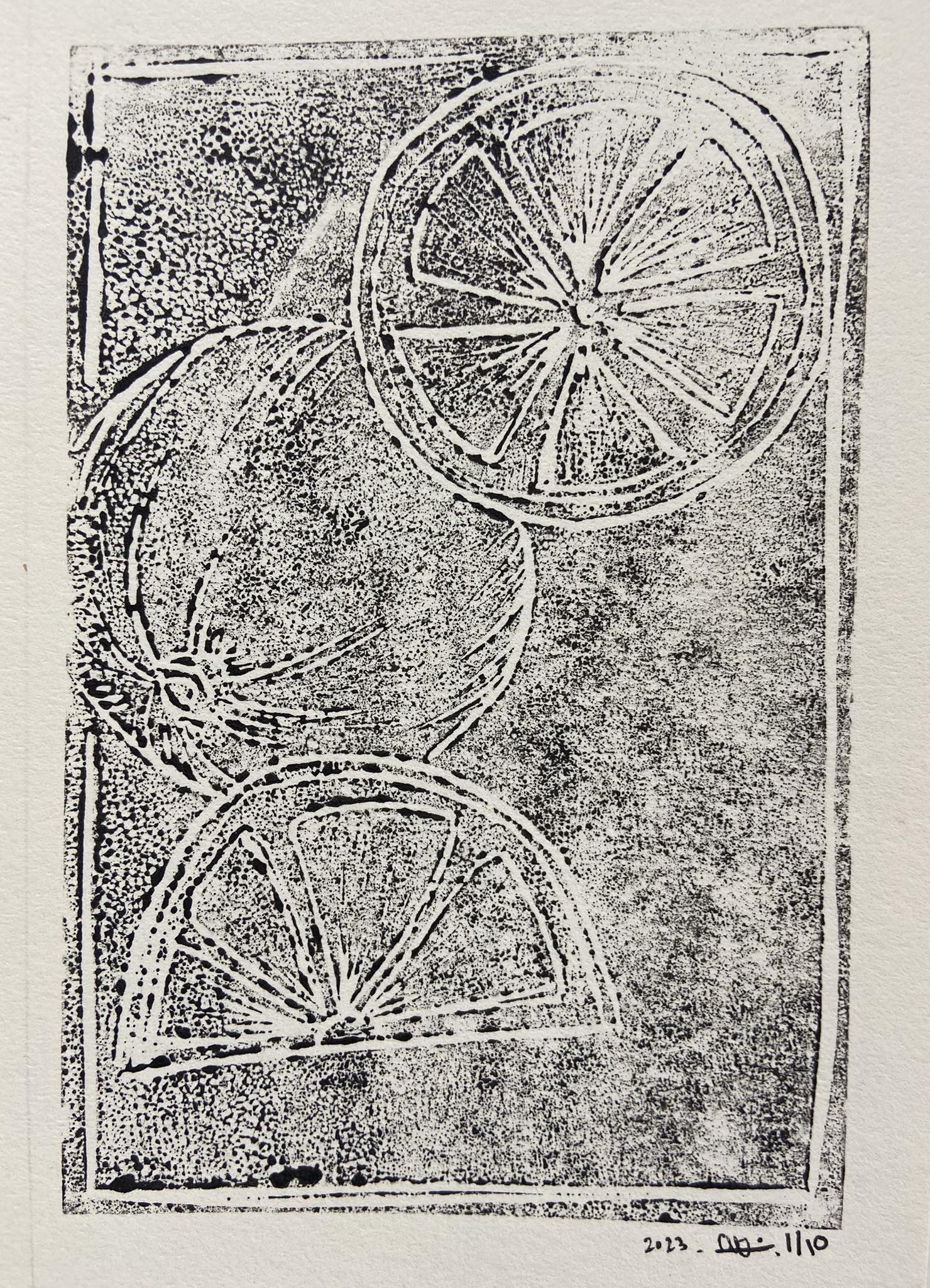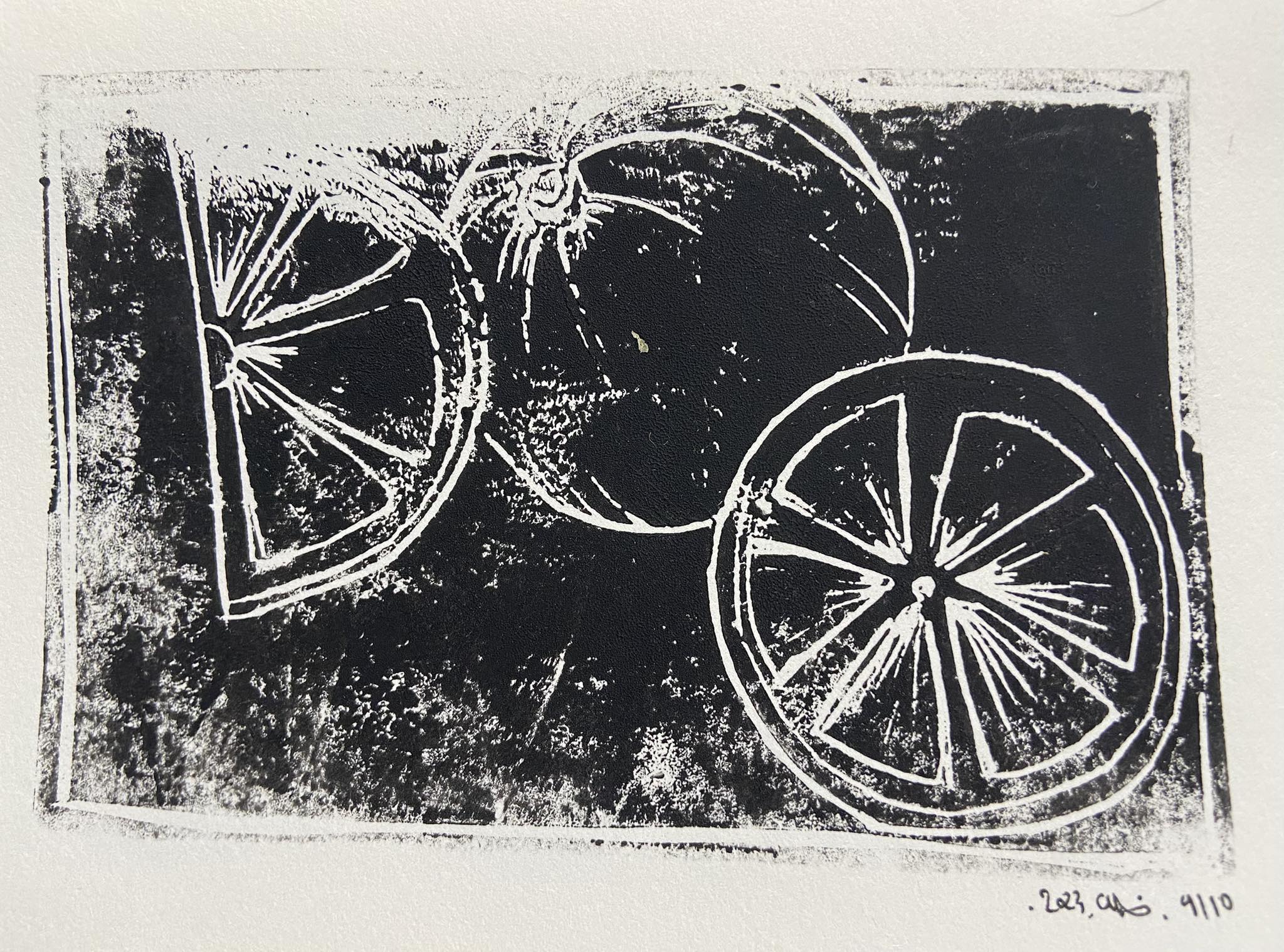 Recherches autour de l’orange, linogravure, 2023.